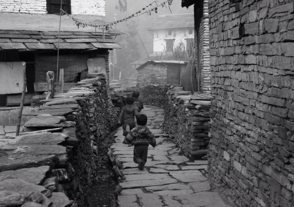 Children run through the narrow streets of Gandruk, near the Annapurna range.